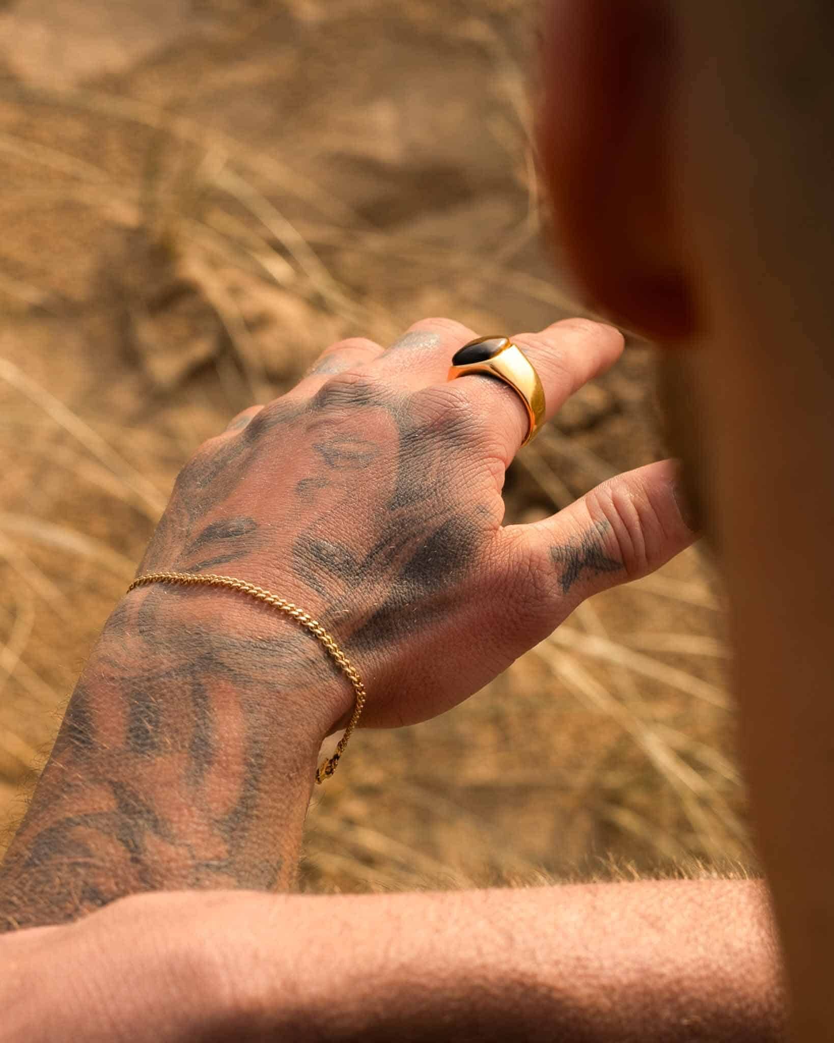 Armbandet är tillverkat i slitstarkt rostfritt stål och pläterat med fem lager äkta 14K guld. Tack vare den robusta konstruktionen behåller kedjan sin glans även vid dagligt bruk. Eftersom materialet är helt vattentåligt kan du bära armbandet under dusch, träning och bastu utan att riskera missfärgning. Det är dessutom hudvänligt och tryggt för känslig hud.